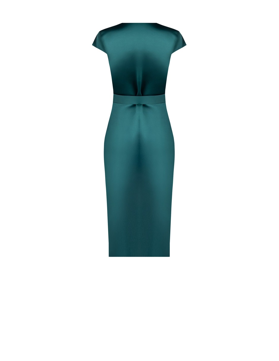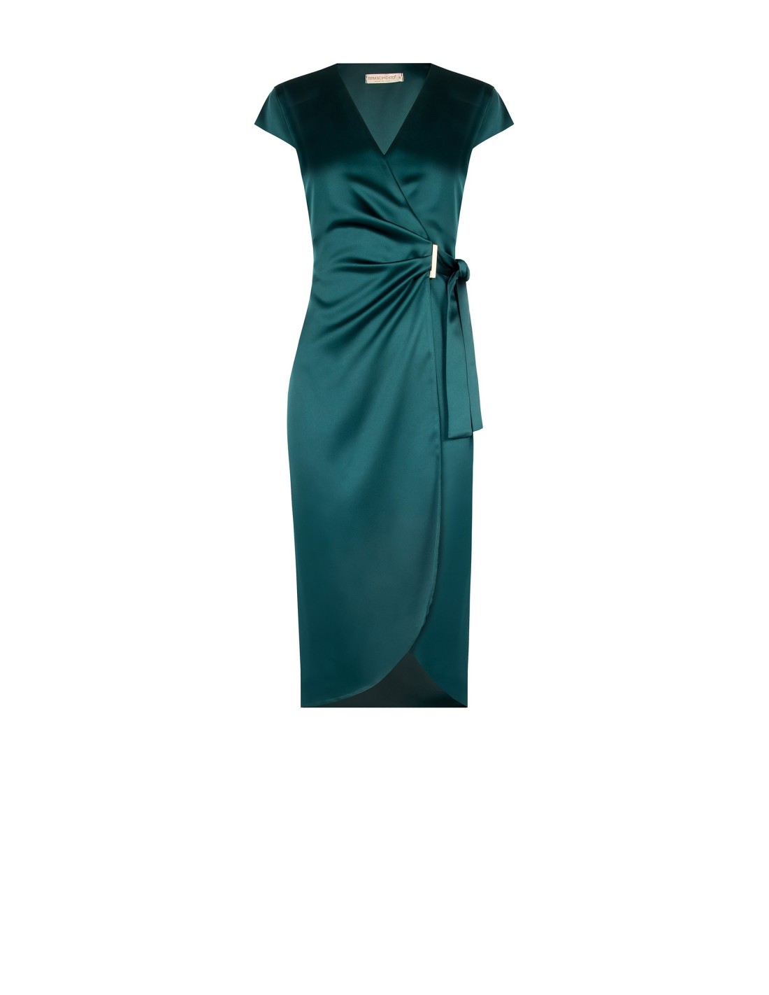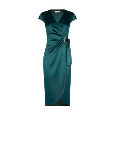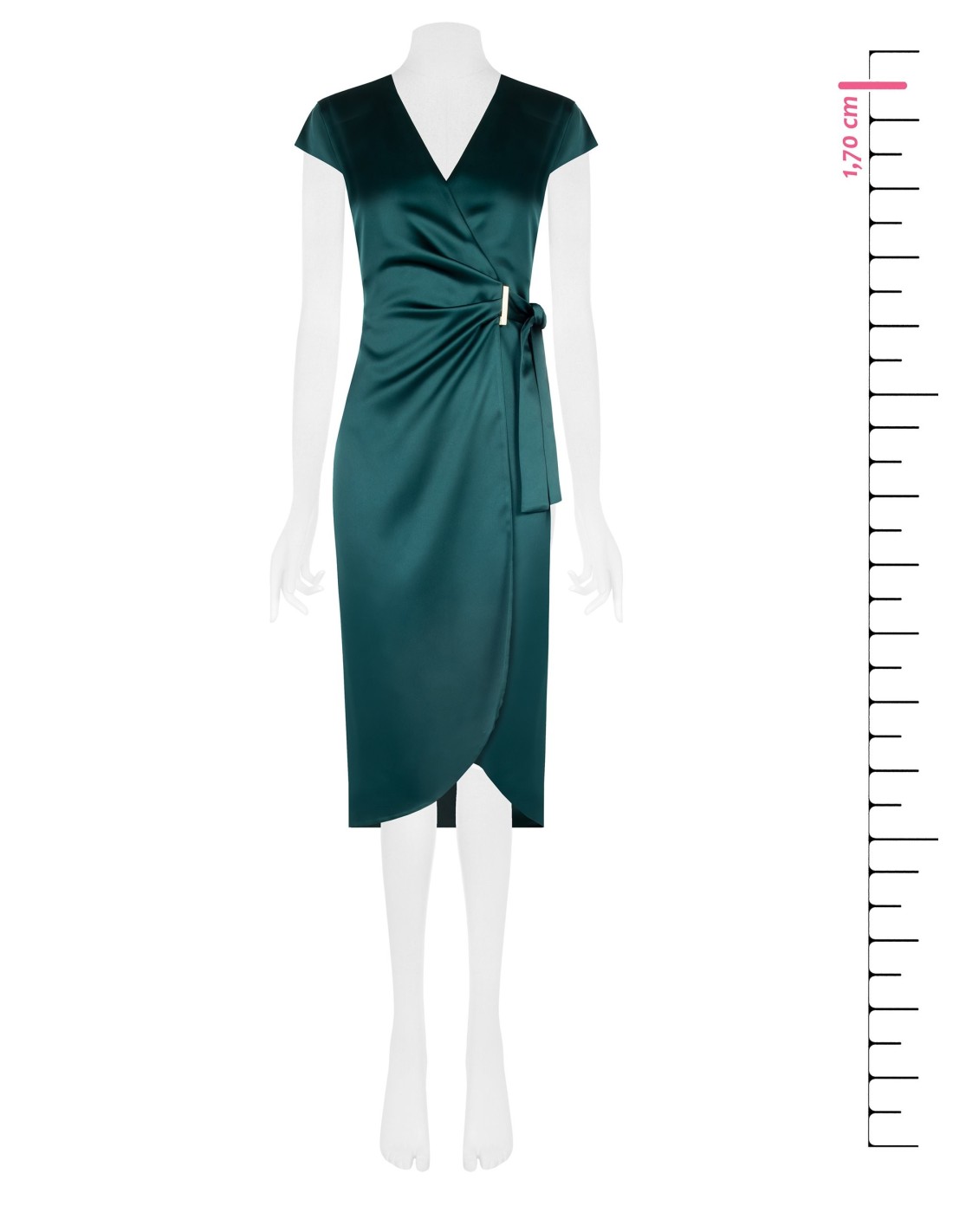 Vestido midi envolvente com um corte justo mas confortável. Cetim fluido e ligeiramente elástico que desliza sobre a silhueta. Decote em V e drapeado lateral com fecho de metal, fundo em tulipa para um corte solto. Perfeito para cerimónias, cocktails e jantares, combina bem com sandálias e clutch essenciais.