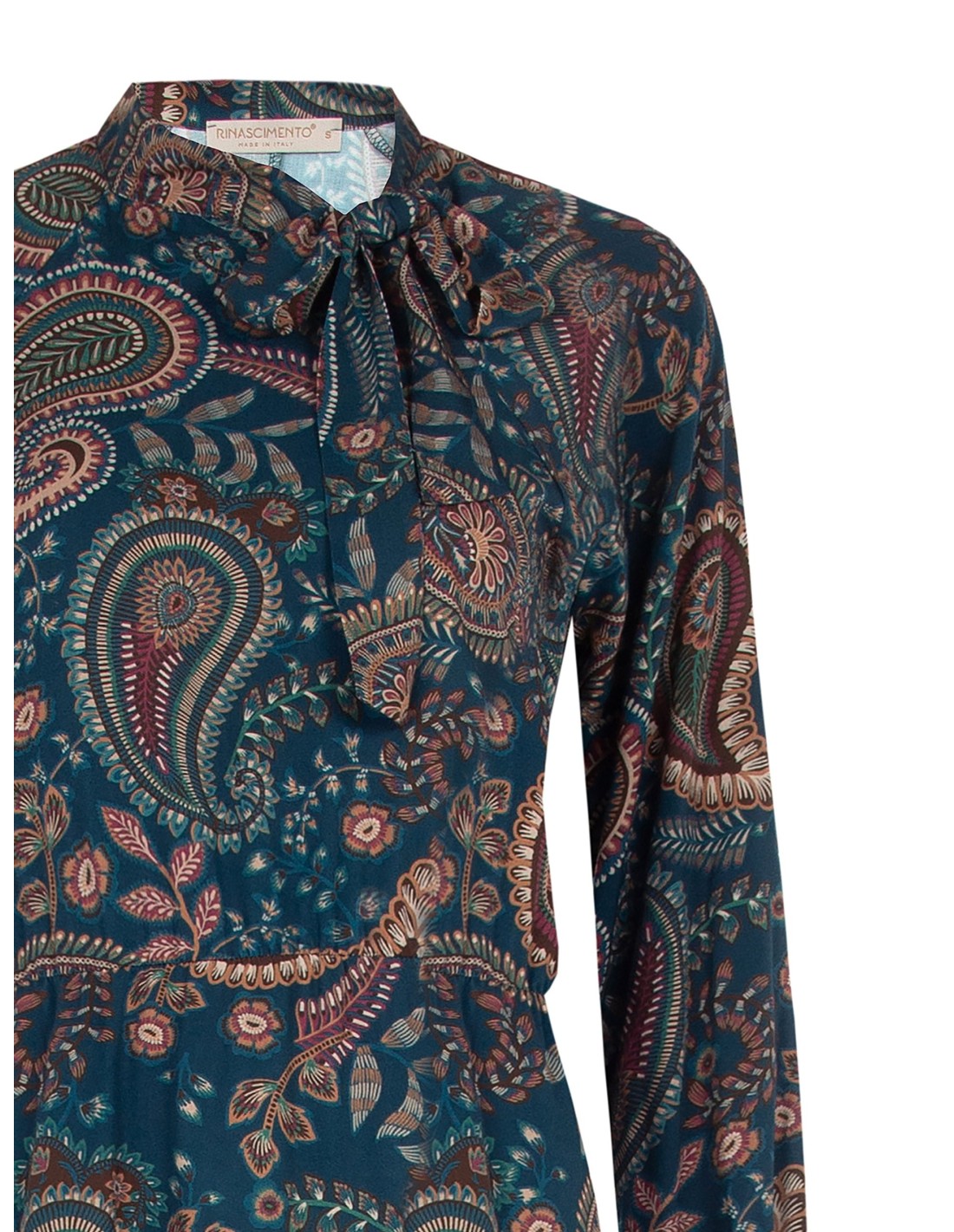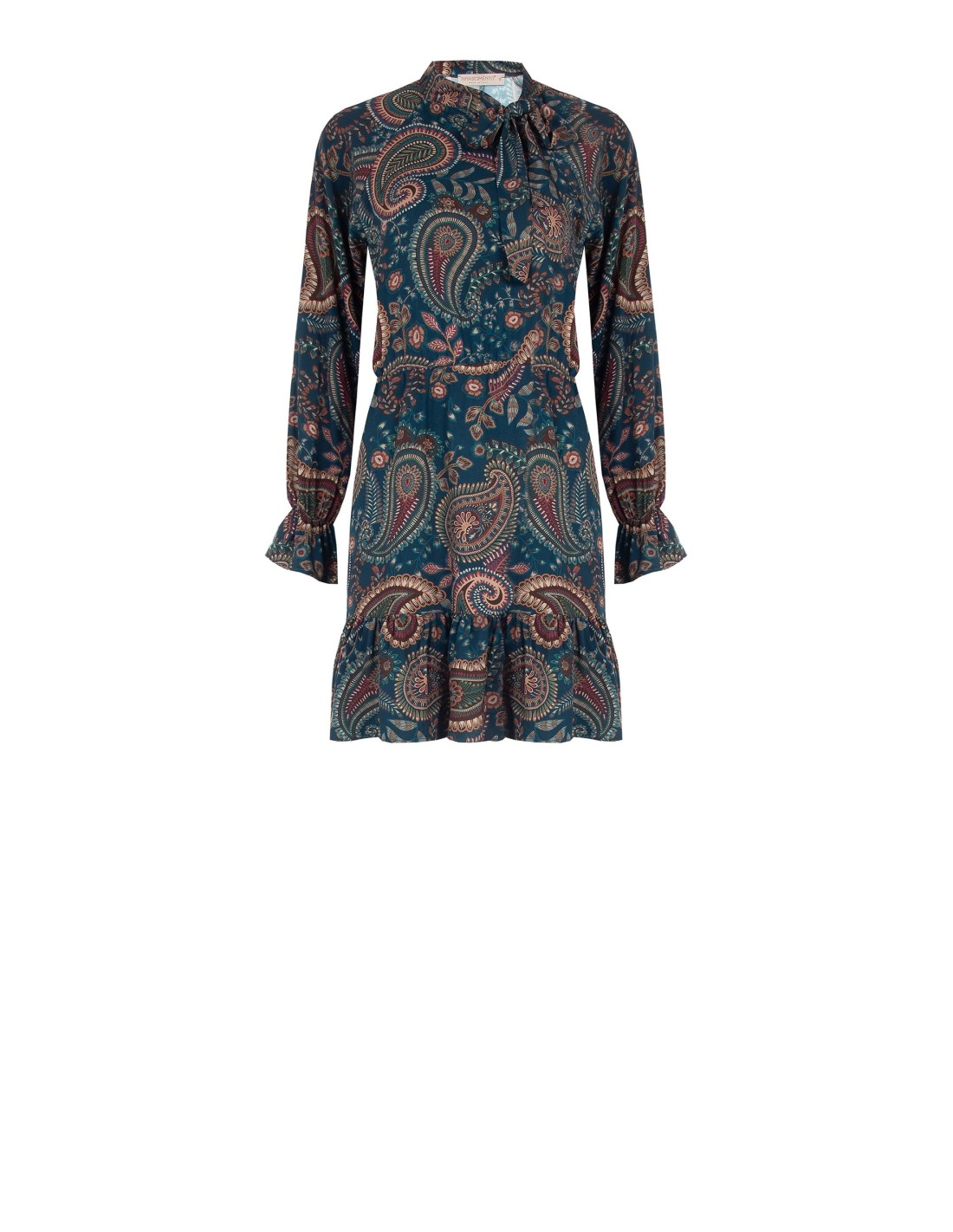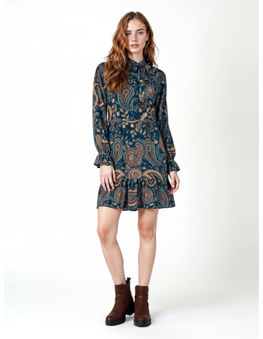 Minivestido fluido com corte evasé que valoriza a silhueta sem marcar. Viscose macia com toque sedoso e estampado paisley. Gola com laço e punhos franzidos, folho na barra para um movimento leve. Versátil do dia para a noite: perfeito no escritório com blazer, ideal para aperitivos e festas com botas ou saltos.