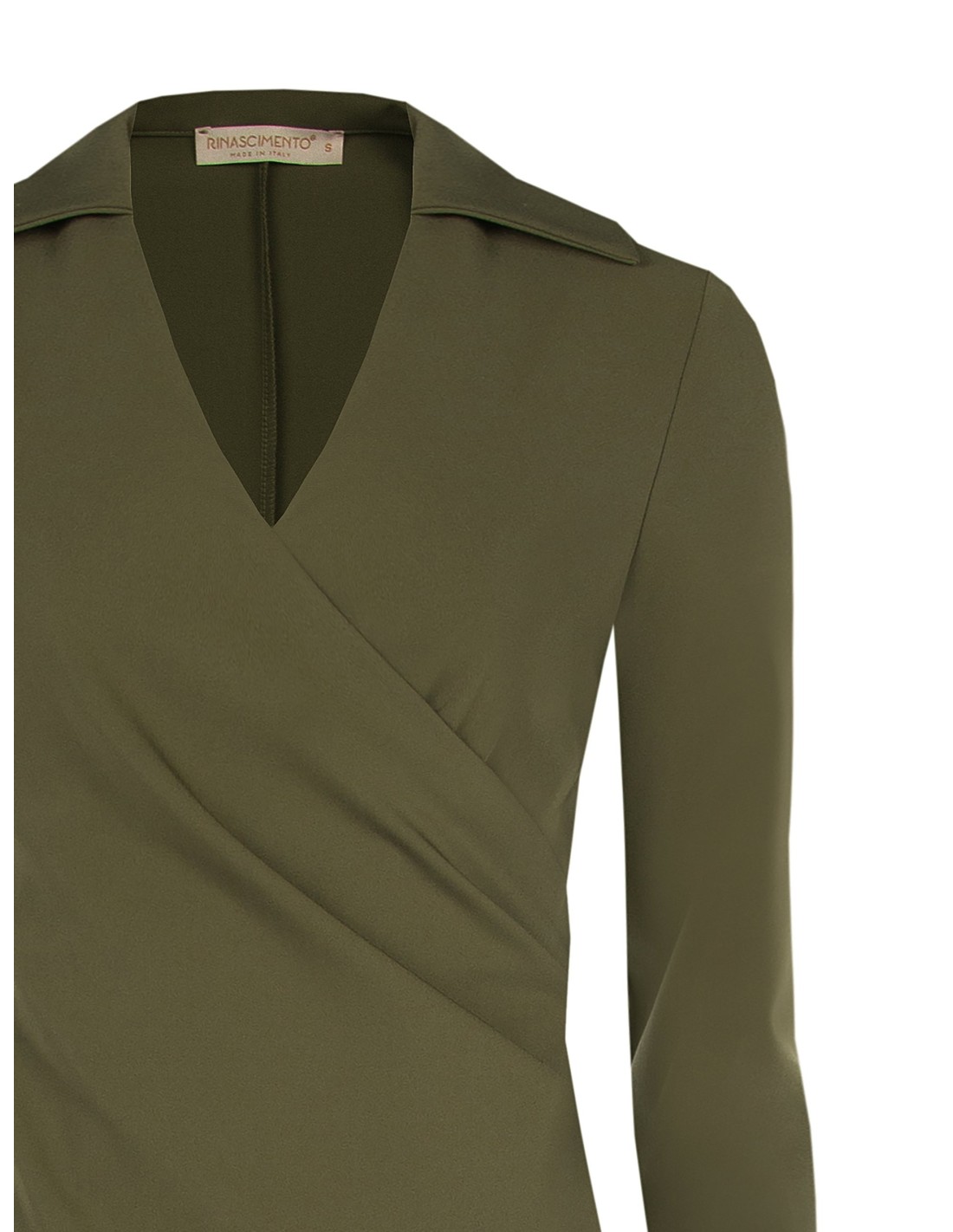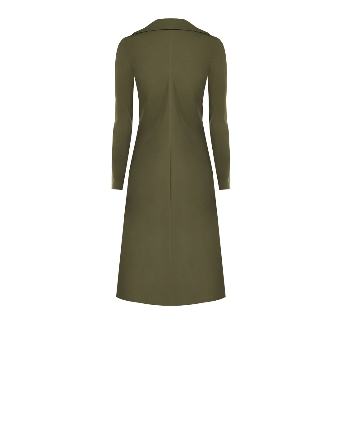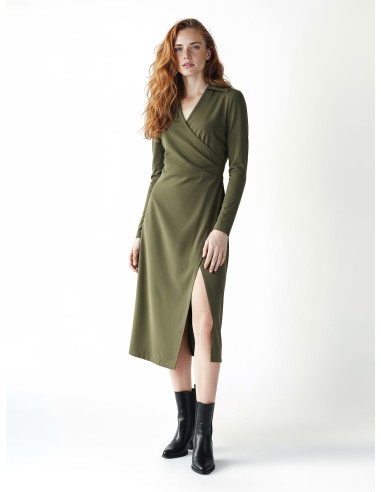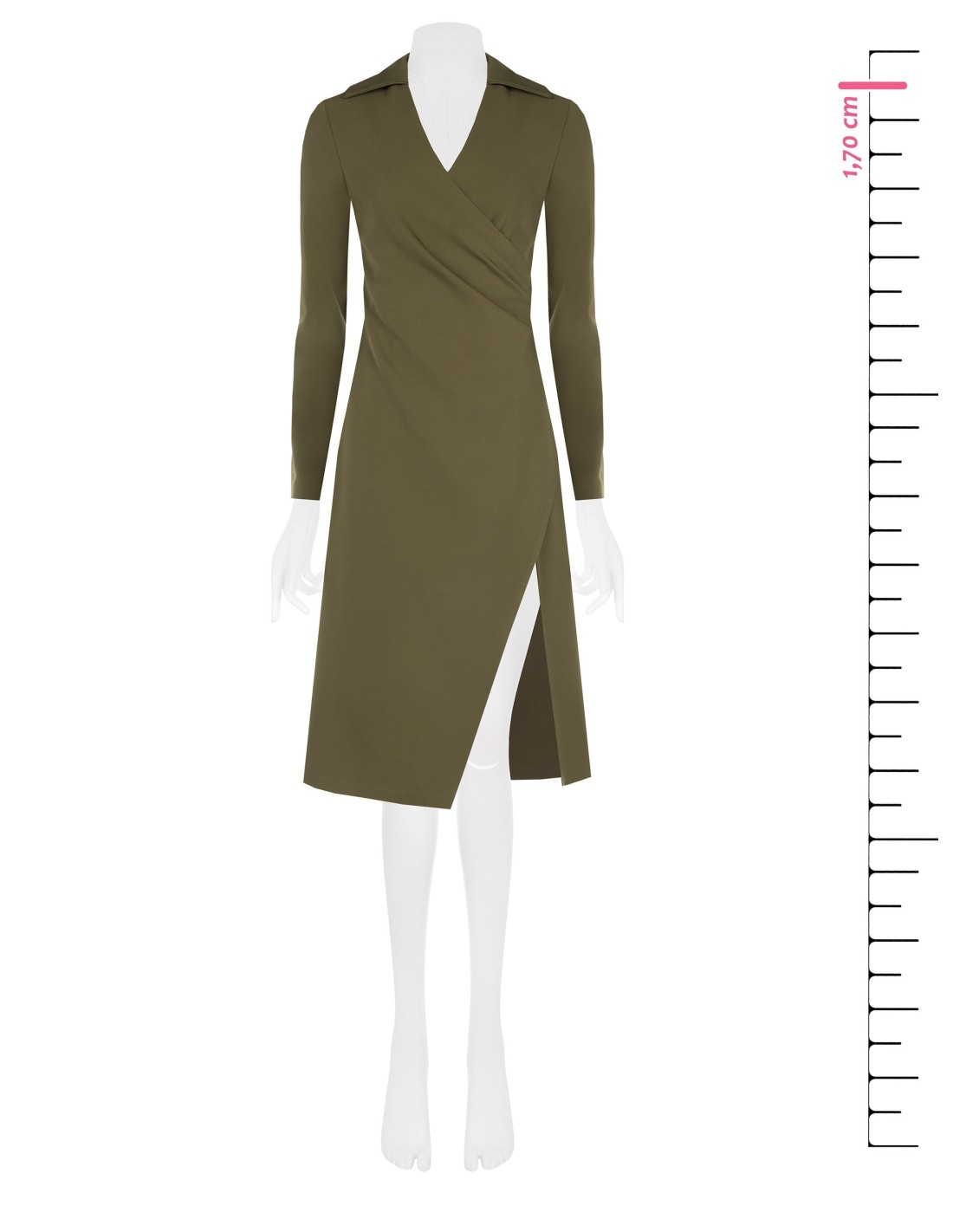 Midi envolvente com corte feminino e justado na medida certa: o drapeado cruzado esculpe a cintura, a fenda lateral alonga a silhueta. Confeccionado em jersey técnico fluido e elástico, confortável durante todo o dia. Gola de lapela e decote em V. Perfeito para o escritório com blazer, sedutor para jantares e festas.