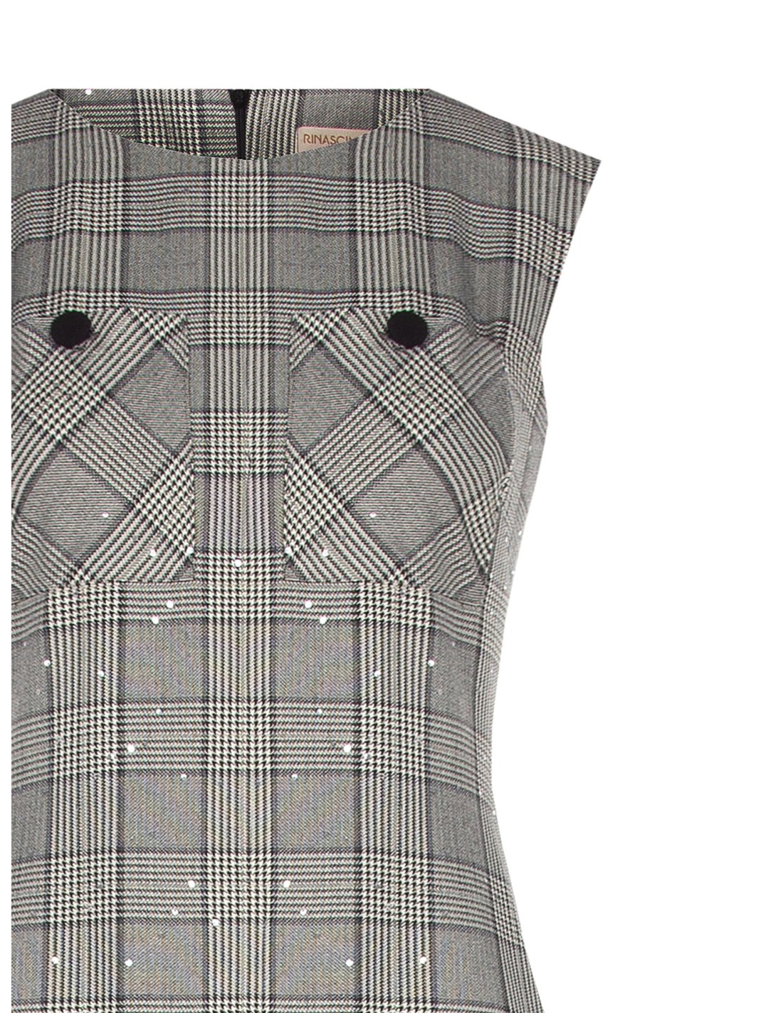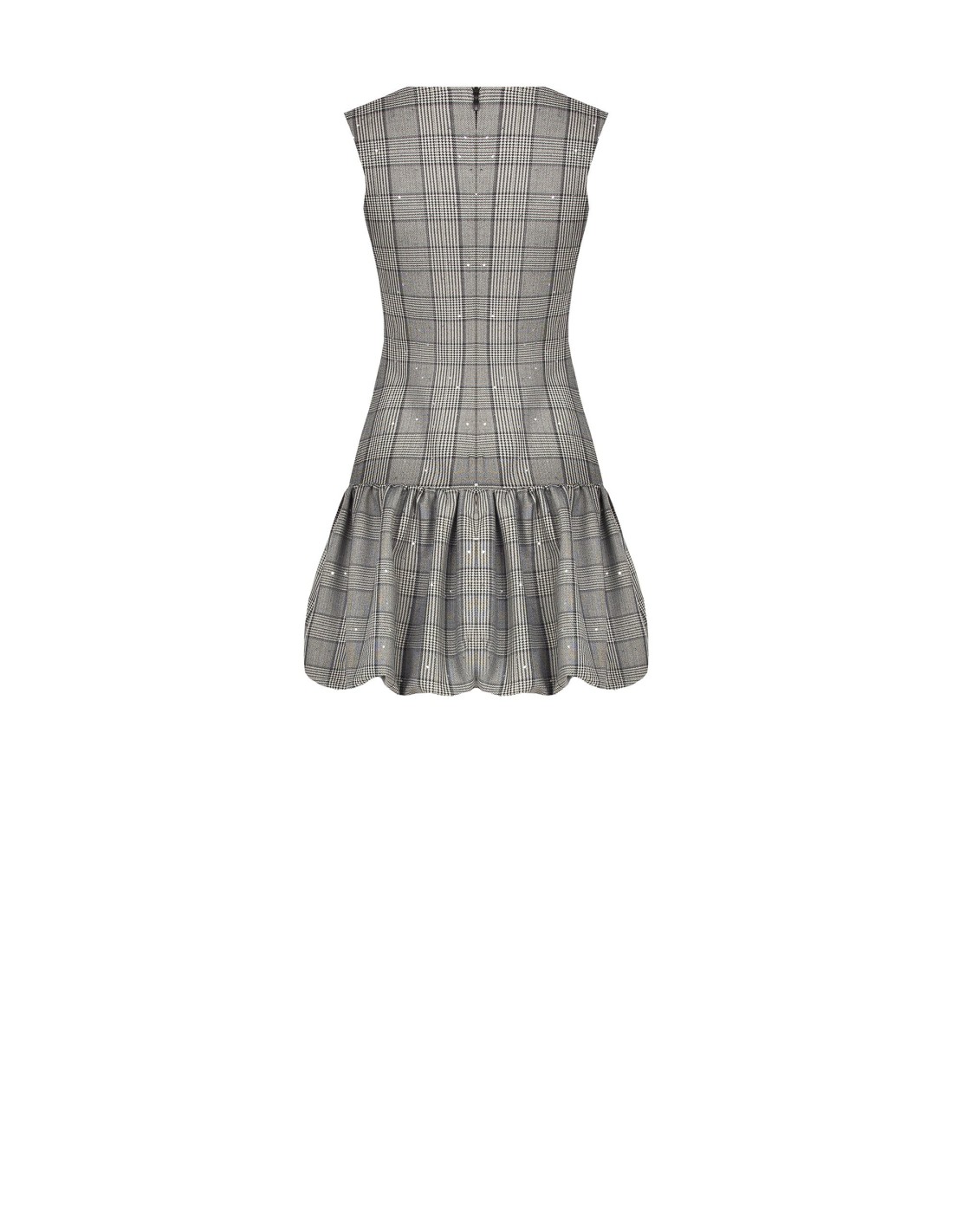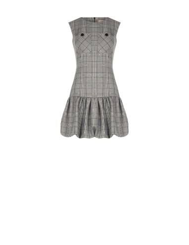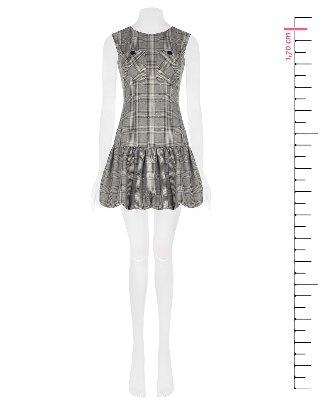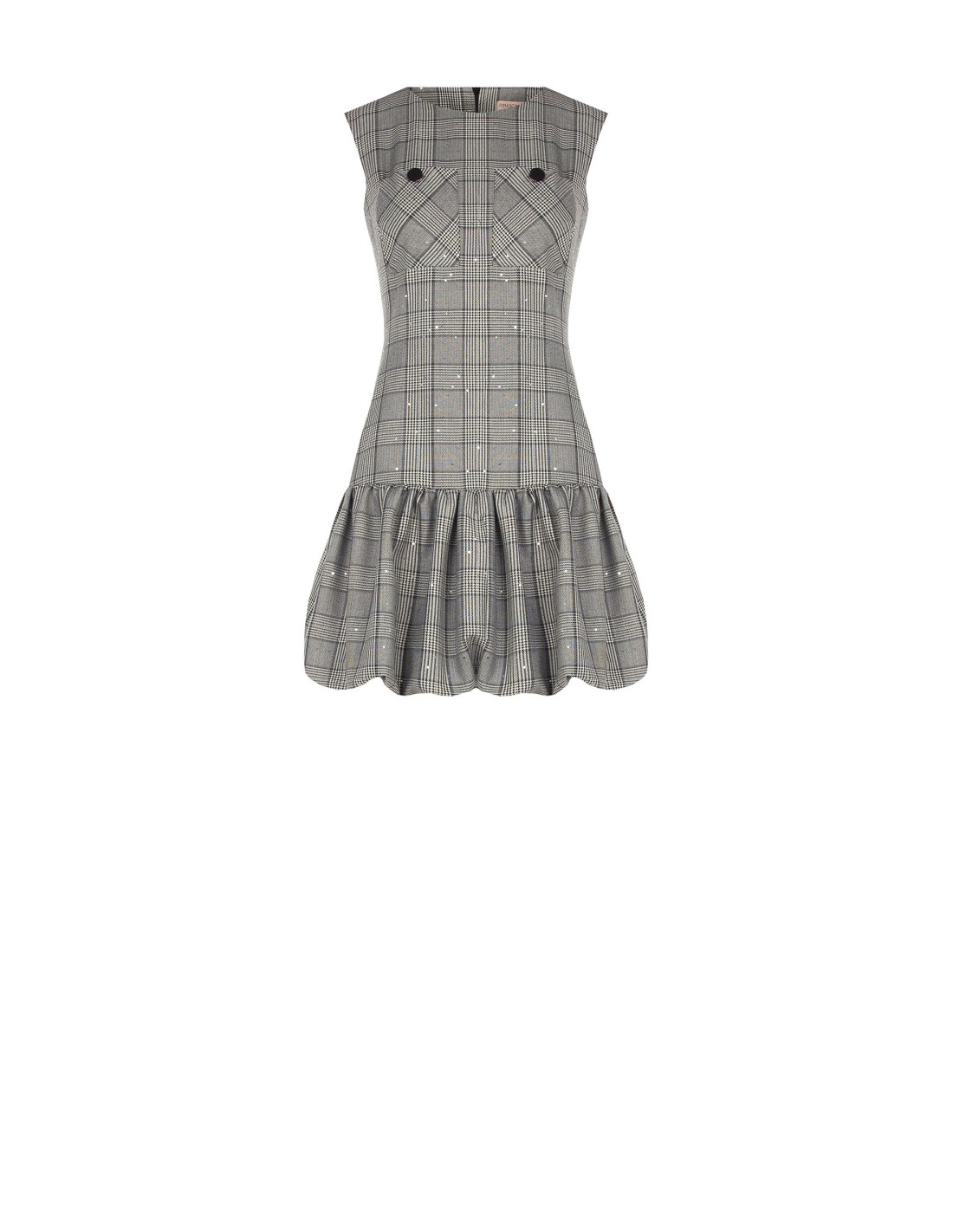 Minivestido evasé com corpo justo no busto e saia com folhos para uma silhueta feminina e dinâmica. Tecido efeito príncipe de Gales com micro lantejoulas, macio e confortável. Bolsos com botões e decote redondo valorizam o decote. Perfeito para o escritório com blazer, ideal para after‑work e festas.