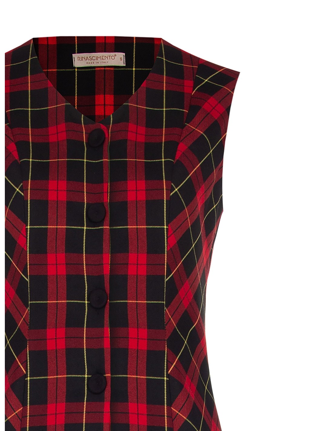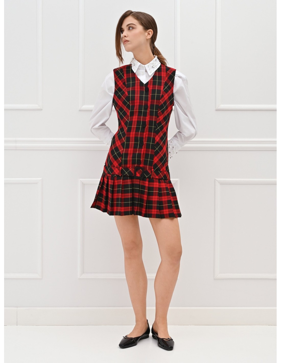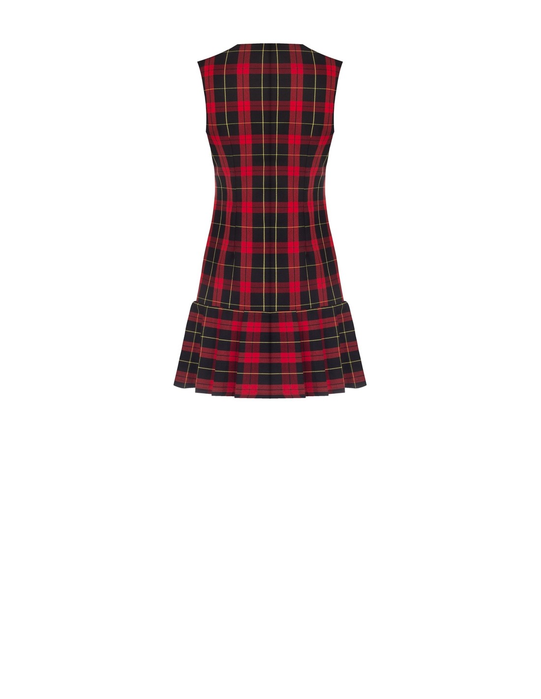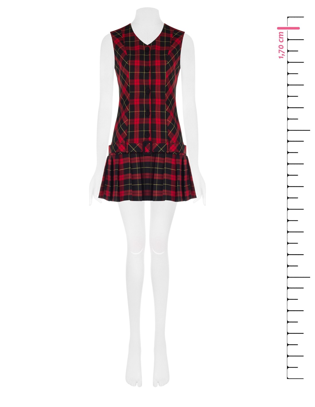 Minivestido Rinascimento de corte evasé e feminino, em tecido tartan de toque macio. Decote em V e fecho frontal com botões revestidos valorizam a silhueta, enquanto a bainha com folho plissado confere movimento. Perfeito com camisa para o escritório ou com biker para o tempo livre e festas.
