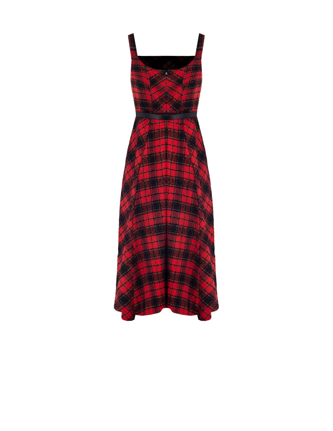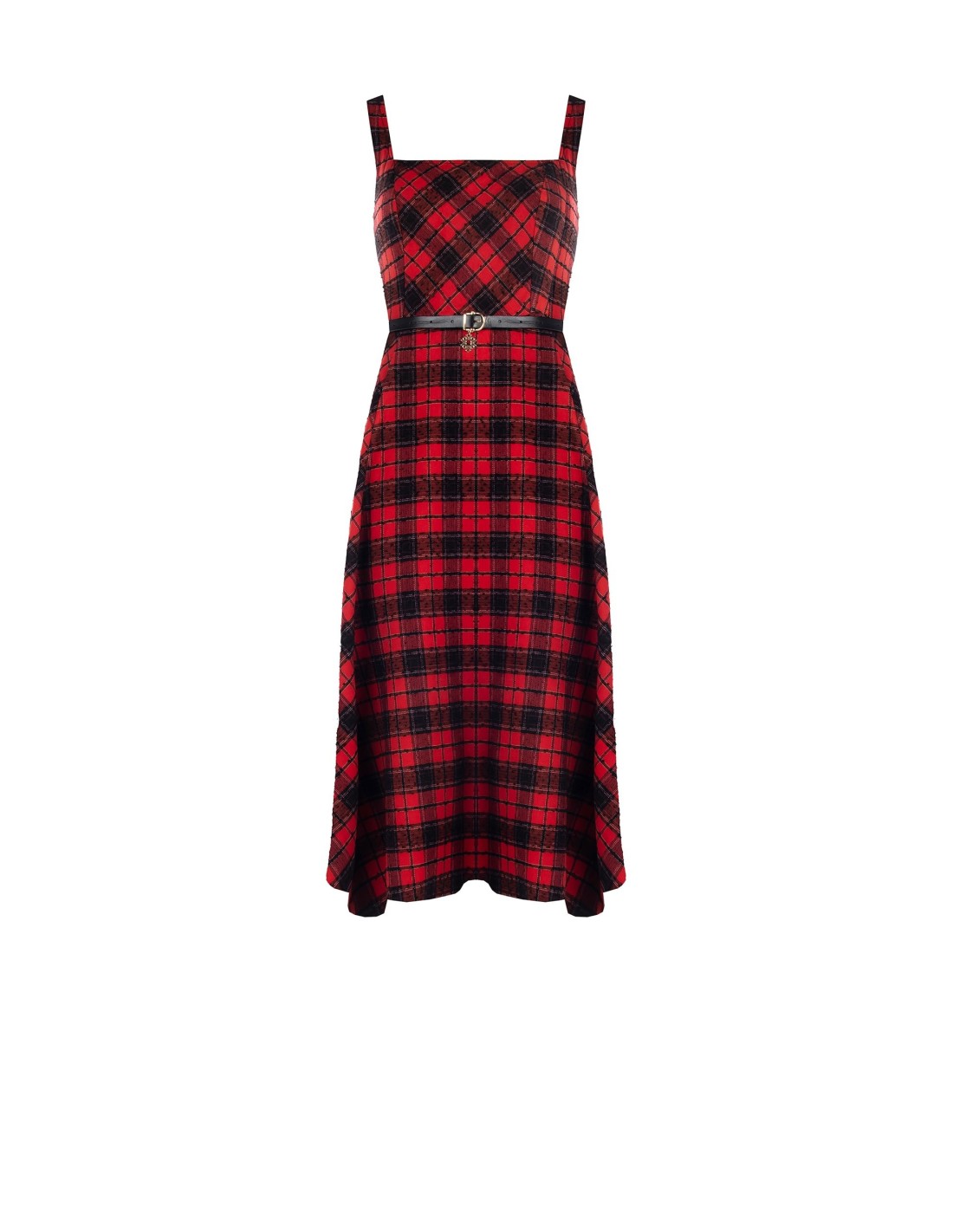 Rinascimento assina uma midi com corte evasé que valoriza a cintura. Tecido macio ao toque quente com padrão xadrez de relevo subtil. Decote recto com alças e cinto fino com pendente metálico para definir a silhueta. Perfeita com gola alta para o escritório ou com sandálias para o tempo livre.