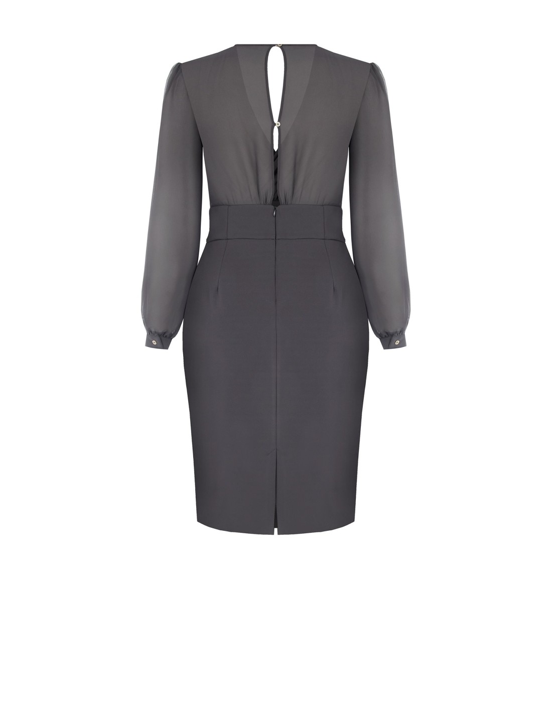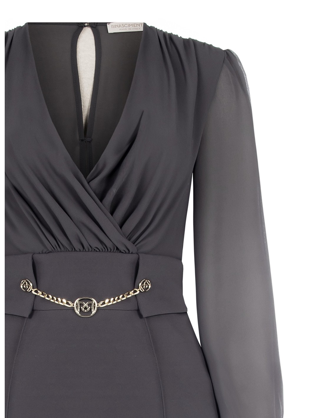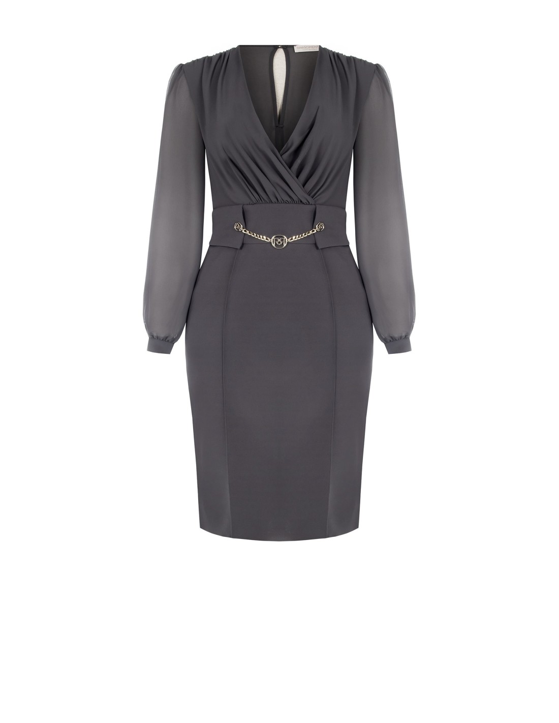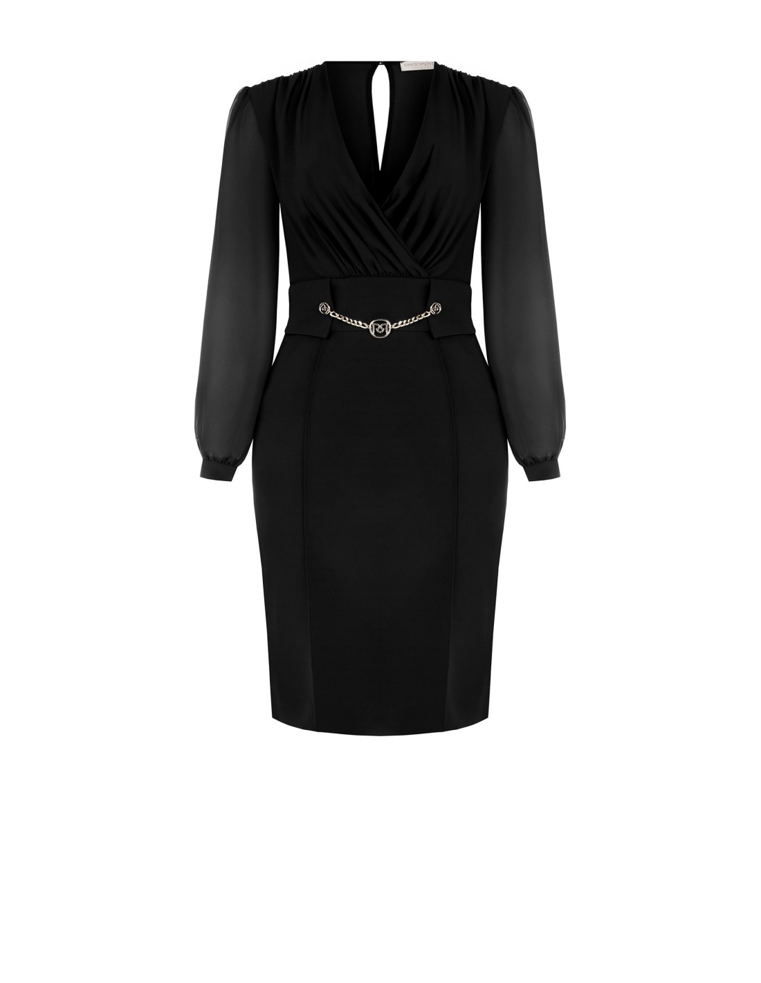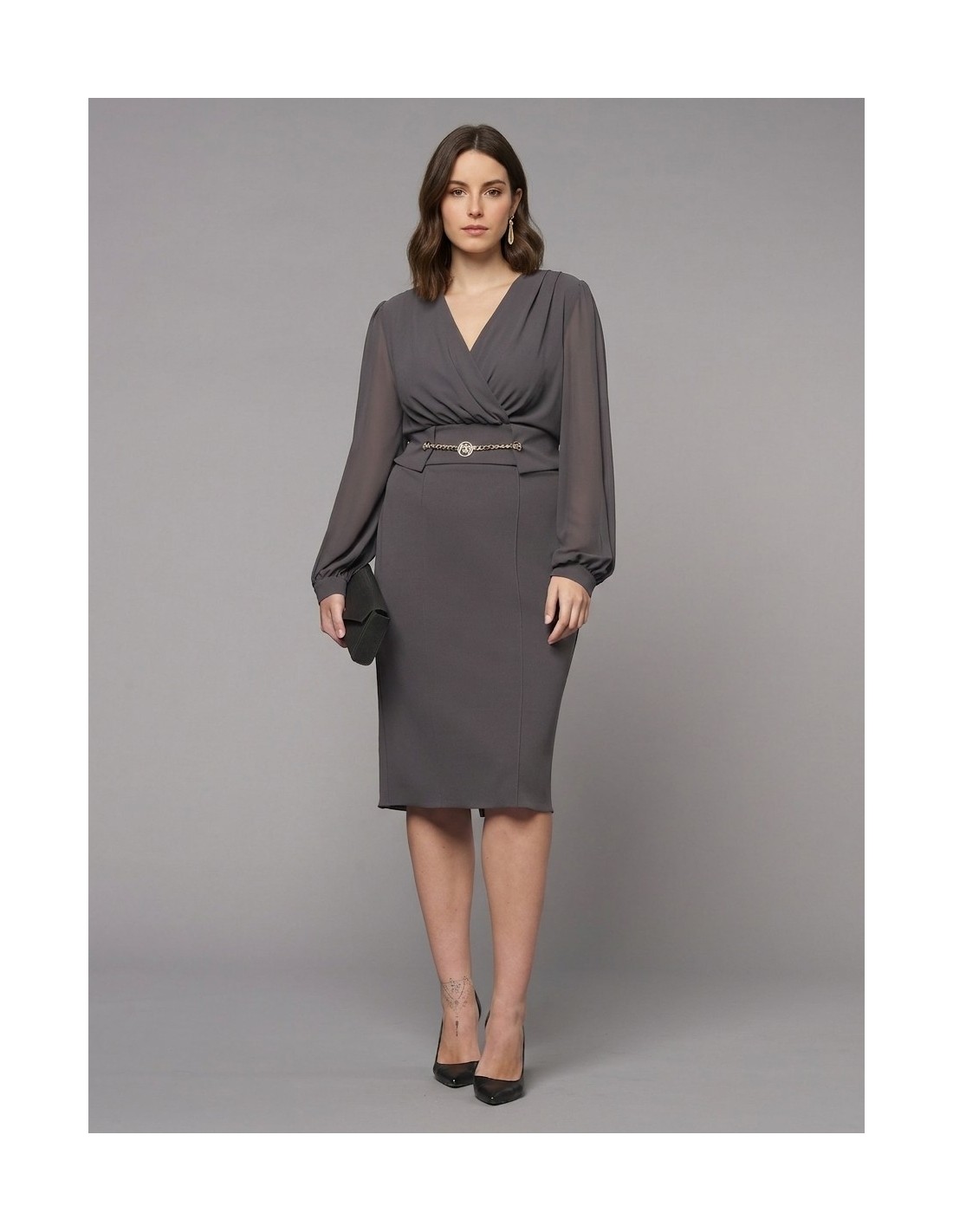 Midi de corte justo, com corpete drapeado e saia modelada que realça a silhueta com conforto. O tecido fluido encontra mangas leves e semi-transparentes; o decote cruzado e a corrente decorativa na cintura definem o ponto da cintura. Perfeito para escritório, cerimónias e eventos noturnos.