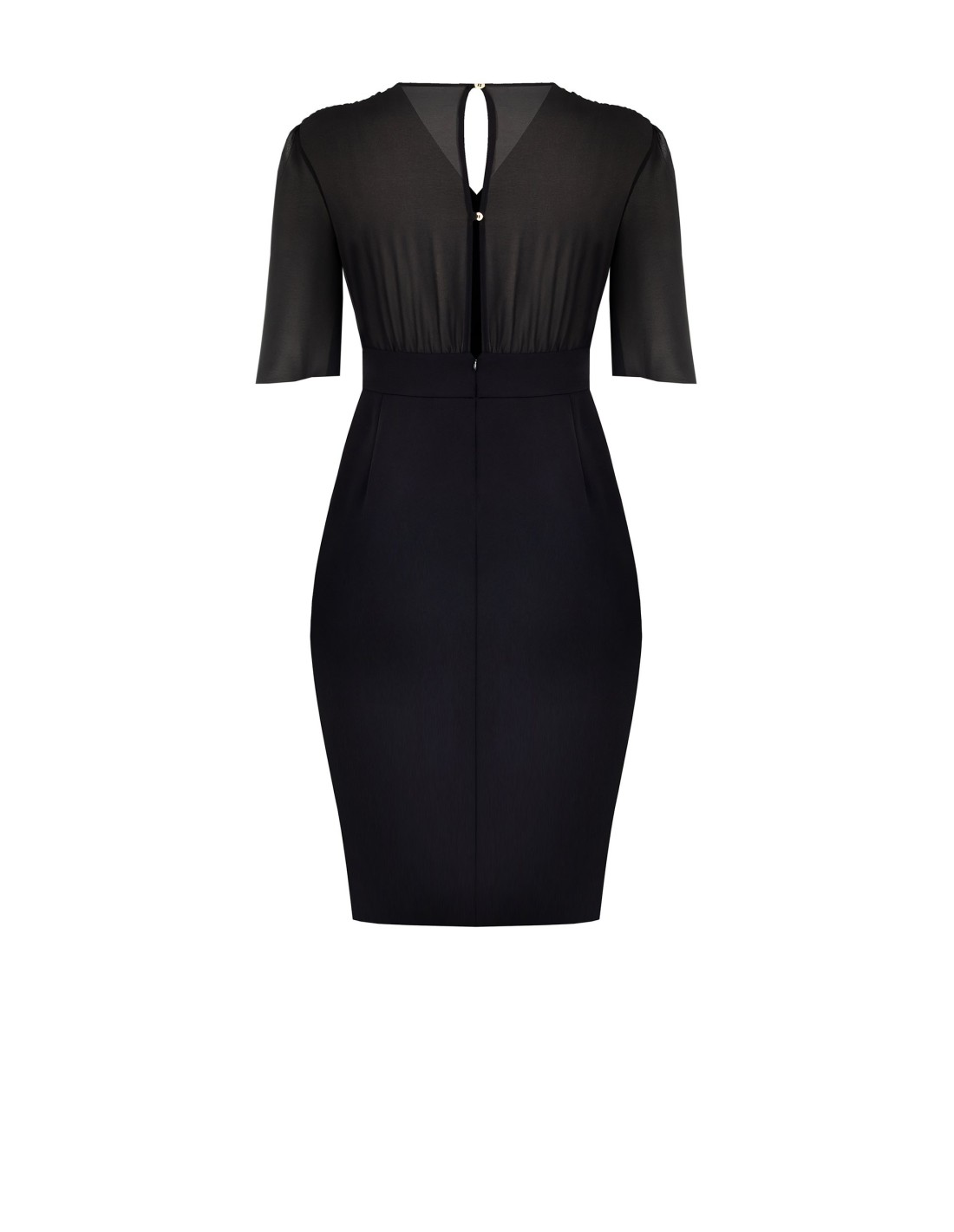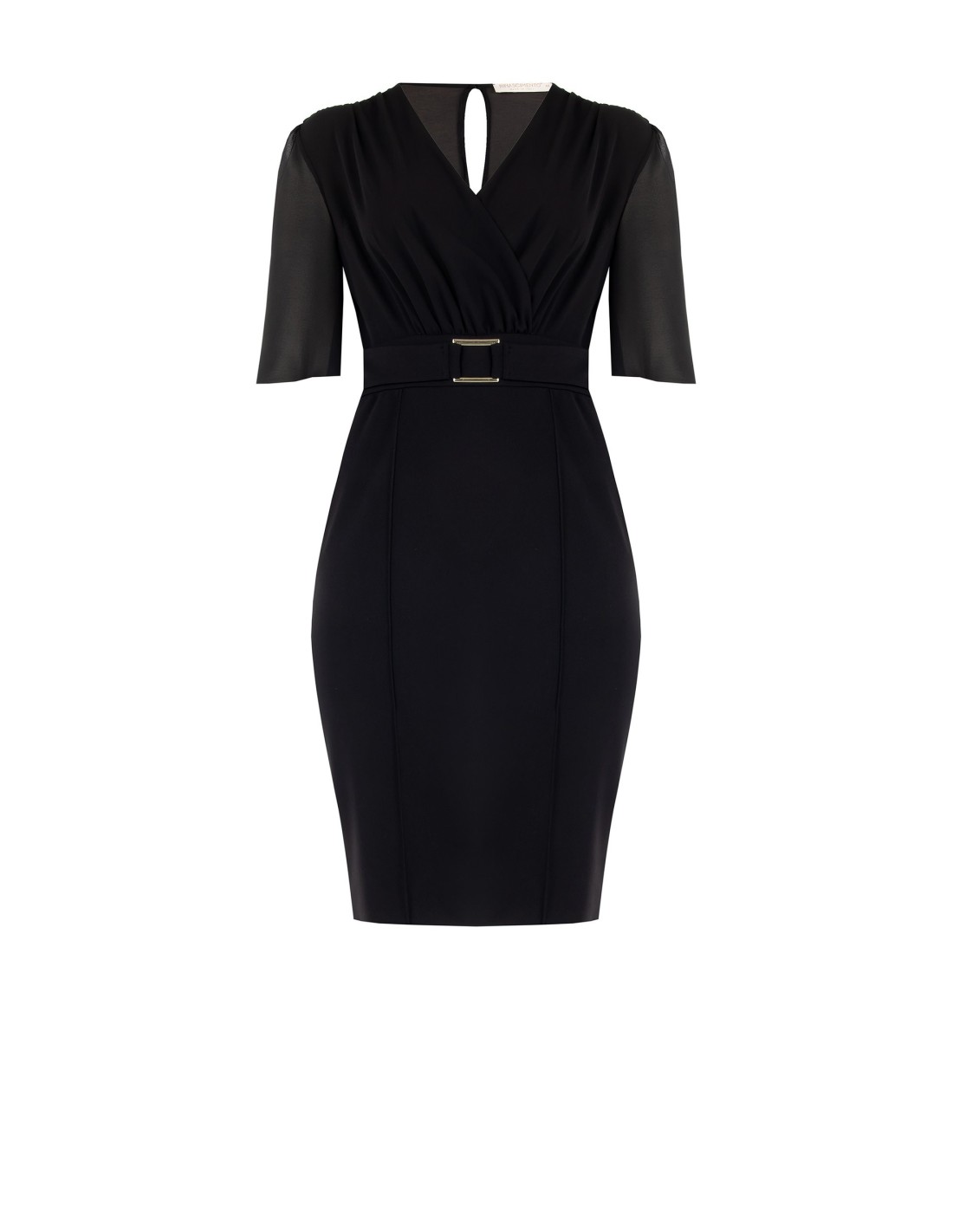 Rinascimento Curvy assina um vestido de bainha com uma silhueta envolvente e cintura definida. Corpete em georgette drapeado, mangas leves e saia em tecido elástico que modela sem apertar. Cinto com fivela de metal e gota nas costas para um toque discreto. Perfeito do escritório ao cocktail.