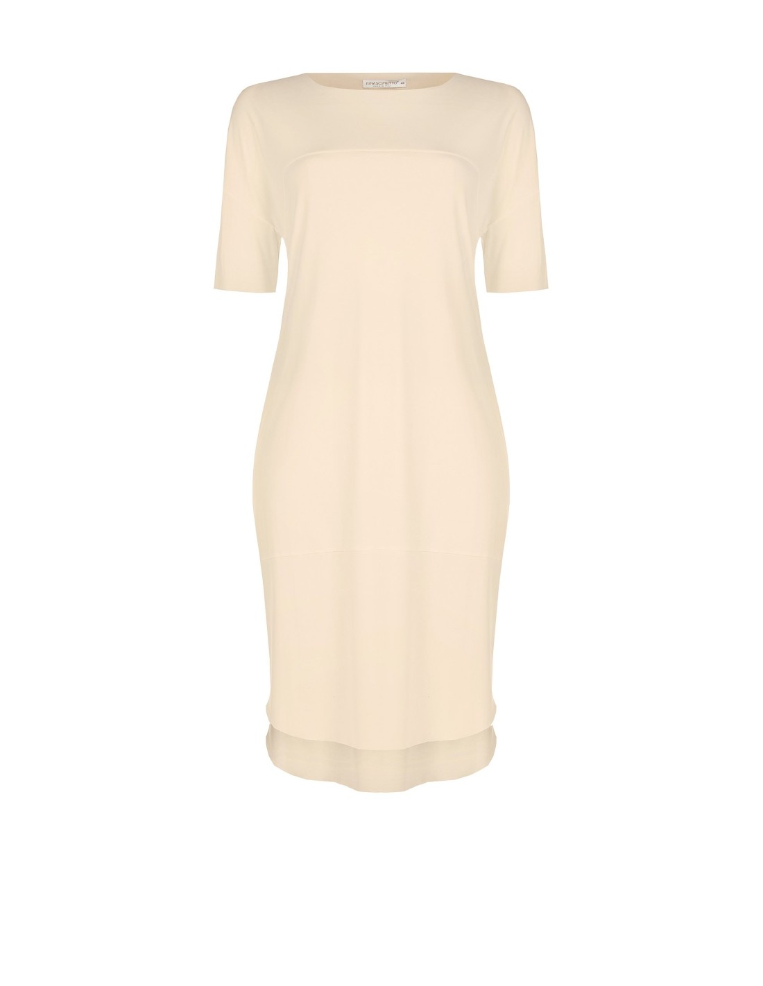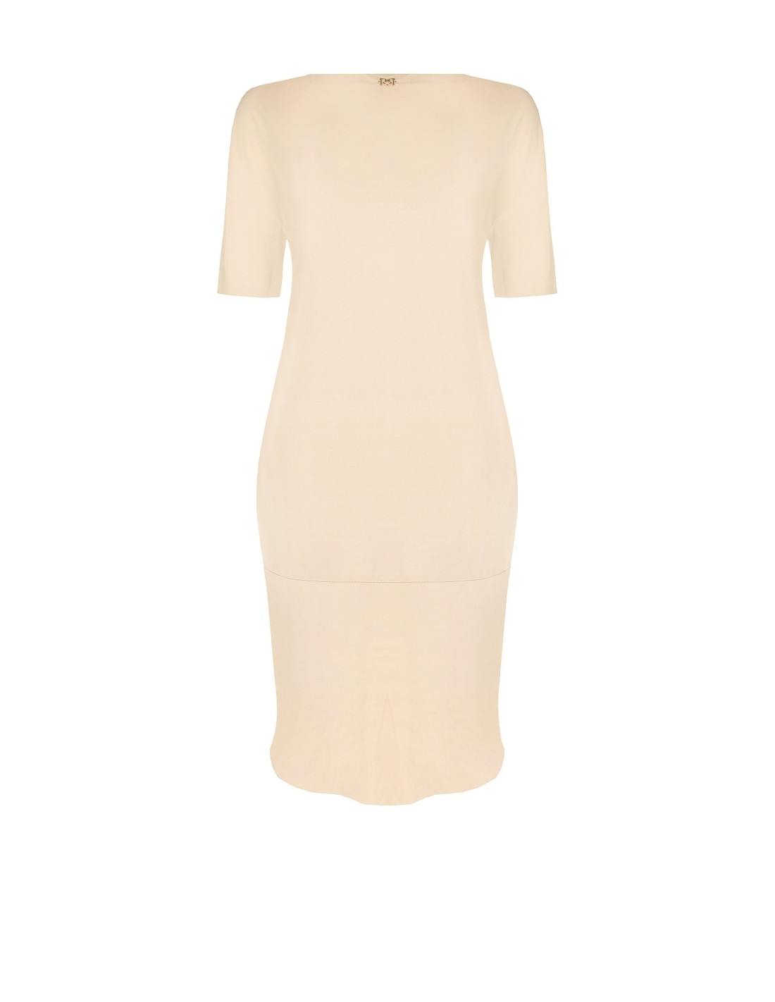 Vestido midi de linha suave e ligeiramente arredondada, pensado para acompanhar a silhueta com conforto. O tecido jersey fluido acaricia o corpo, enquanto o decote com corte cru e as costuras em destaque adicionam carácter. Perfeito para o escritório, para o dia a dia e para momentos casual chic.