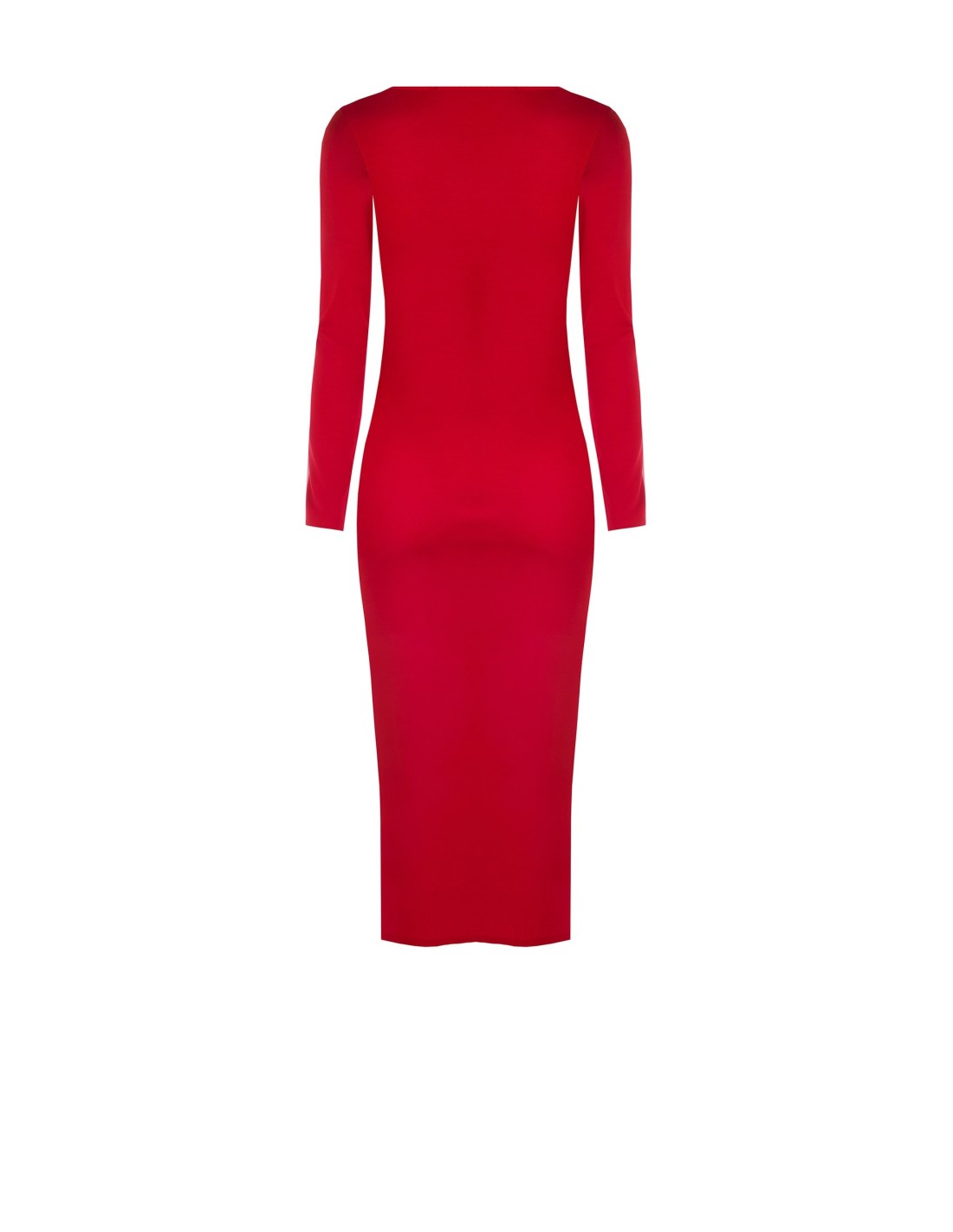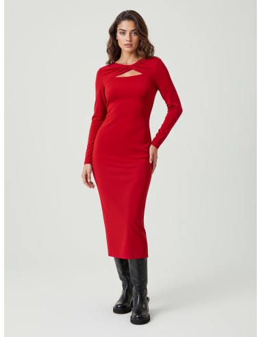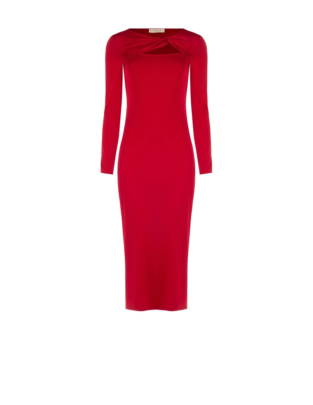 Rinascimento midi justo que esculpe a silhueta com conforto. Malha fluida elástica, toque macio. À frente, nó drapeado com delicado recorte e mangas compridas para um equilíbrio perfeito. Versátil do escritório ao cocktail: com blazer no trabalho, com sandálias e clutch para a noite.