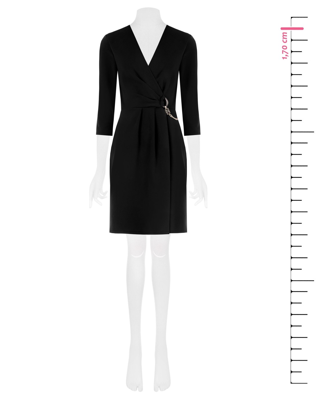 Rinascimento assina um modelo midi com uma linha justa mas confortável. O tecido scuba crepe esculpe sem apertar, valorizando a silhueta. Decote em V cruzado e cinto com anel e corrente iluminam a cintura. Mangas 3/4, drapeado lateral. Perfeito para escritório e aperitivo, com saltos ou botas.