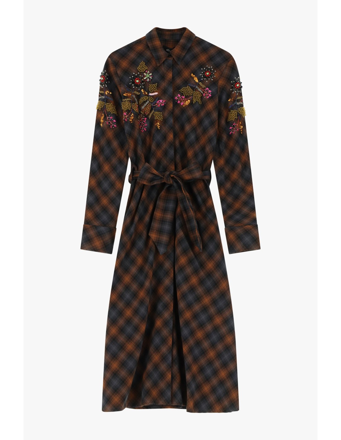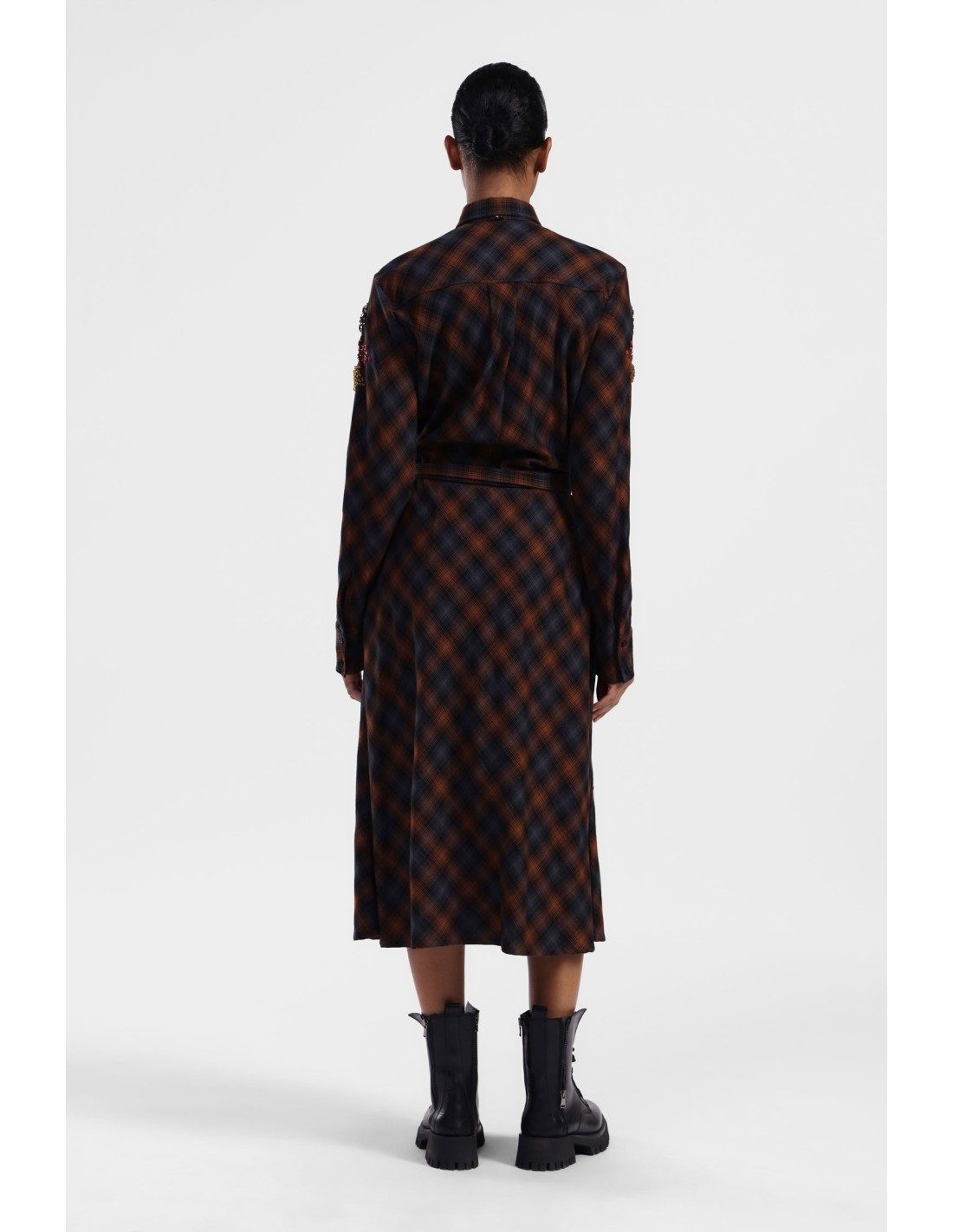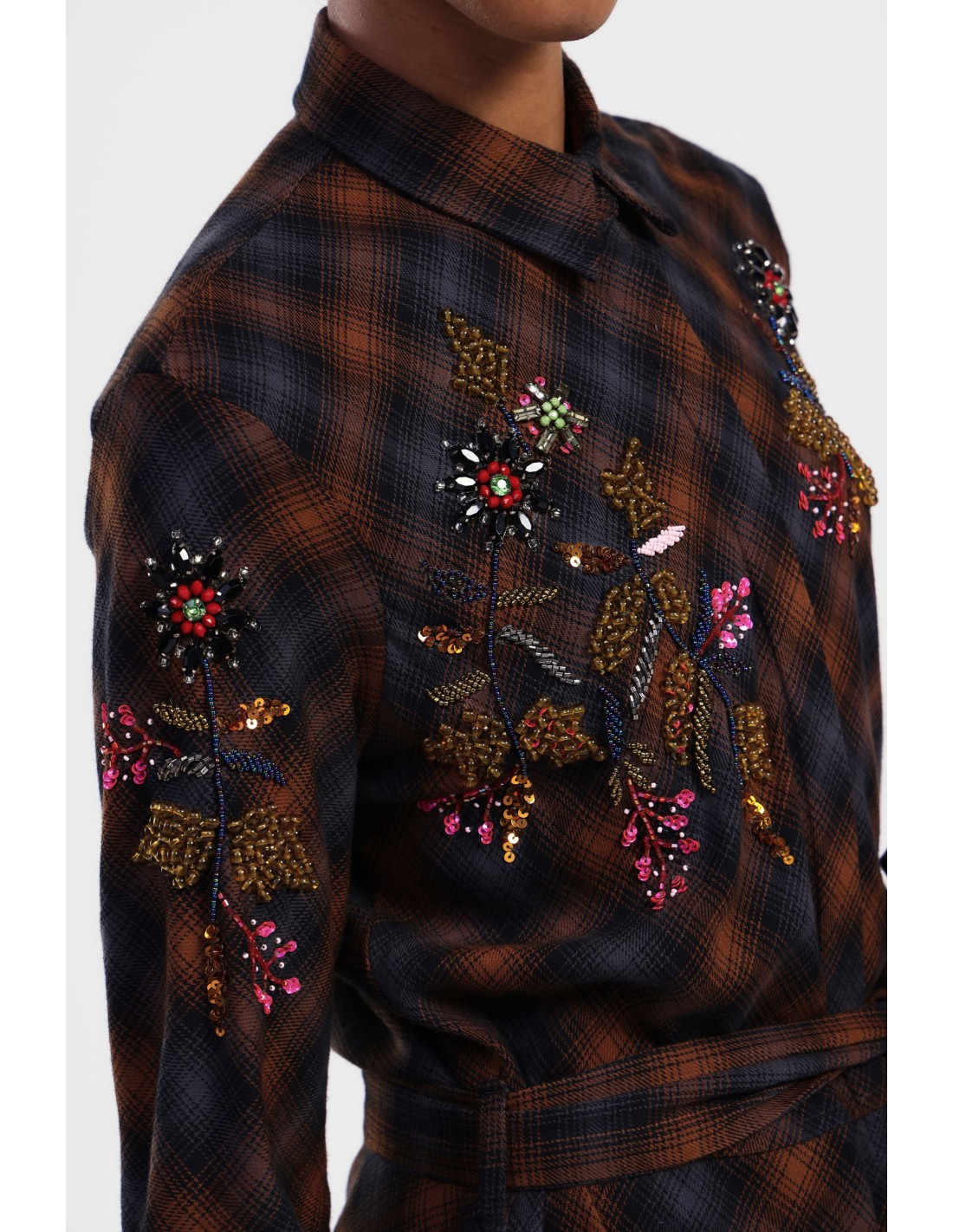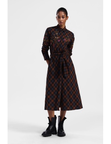Imagine passear pela cidade com este vestido de xadrez que mistura estilo e conforto. Os detalhes florais bordados dão um toque único e requintado, enquanto o corte de comprimento médio o torna versátil para qualquer dia. A manga comprida e a gola clássica completam este modelo, perfeito para se sentir especial em qualquer ocasião.