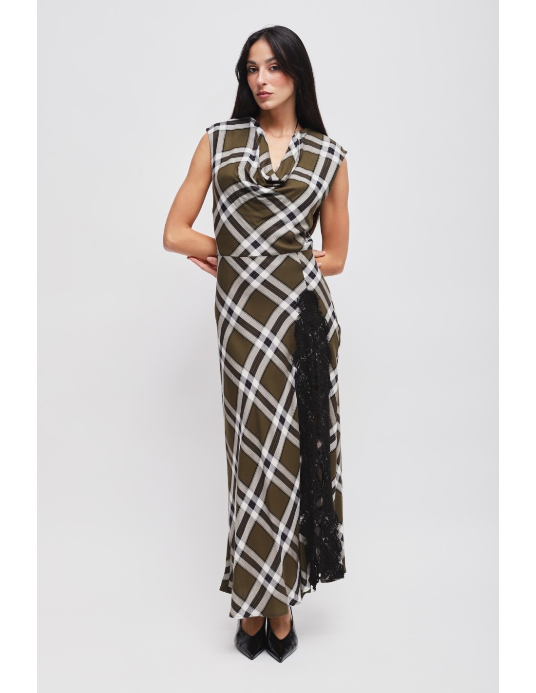 Vestido longo elegante sem mangas em padrão tartan. Apresenta um sofisticado decote em cascata e uma abertura lateral embelezada com um detalhe em renda preta em contraste. Ideal para noites, eventos e looks casuais elegantes.