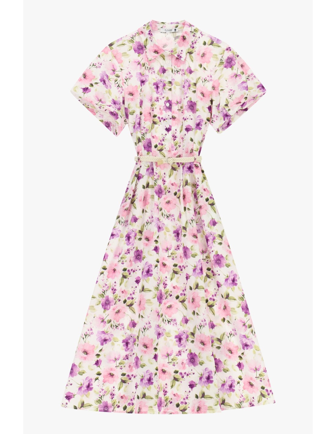 Vestido longo com estampa floral, mangas curtas e fecho frontal com botões. O corte fluido e o cinto coordenado na cintura proporcionam um ajuste confortável e valorizam a silhueta. Perfeito para reinventar o look do dia a dia com um toque fresco e prático.